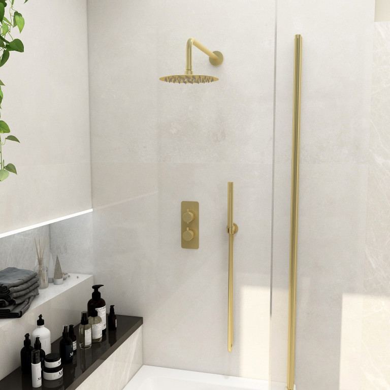 Ravine 2 handle, dual diverter concealed thermostatic valve with 200mm fixed head, pencil handset and smooth hose in Brushed Brass - Brand