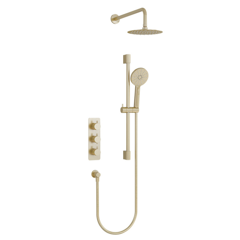 Ravine 3 handle, dual diverter concealed thermostatic valve with adjustable and 200mm fixed heads in Brushed Brass