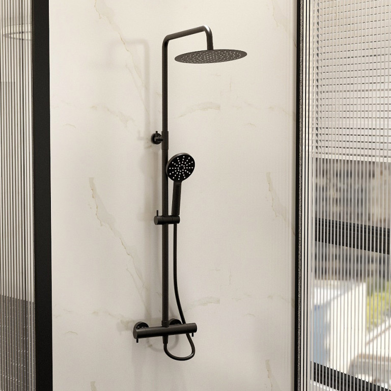 Ravine Cool Touch, Easy Fix, Thermostatic Shower Set in Cmatt Black with Fixed overhead shower and Multifunction sdjustable Handset - Matt Black Finish