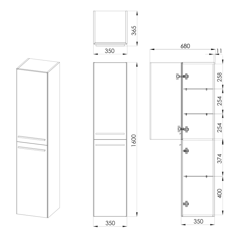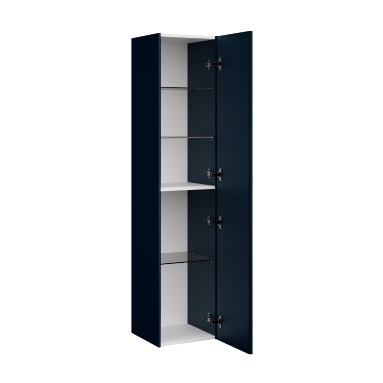 The Berwick wall unit is a versatile and stylish companion to the Berwick vanity unit. Its design is characterised by sleek angled edges, a modern slim bar handle and two doors revealing one fixed central shelf and 3 glass shelves. - Berwick 350mm two door wall unit.