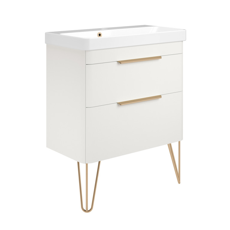 Crofton 2 Drawer Vanity 700mm with Ceramic Basin, Brushed Brass Loop Legs and Handles -...
