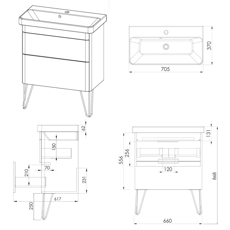 Crofton 2 Drawer Vanity 700mm with Ceramic Basin, Matt Black Loop Legs and Handles -...