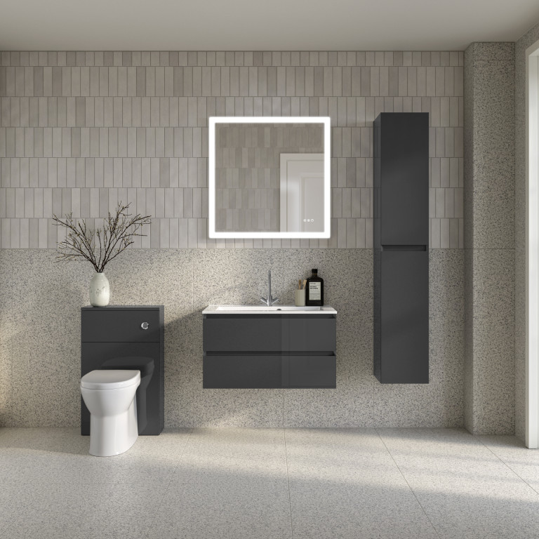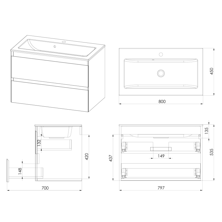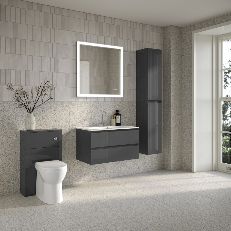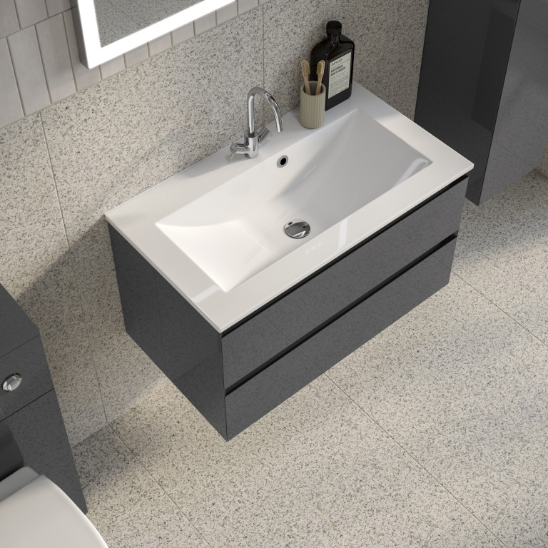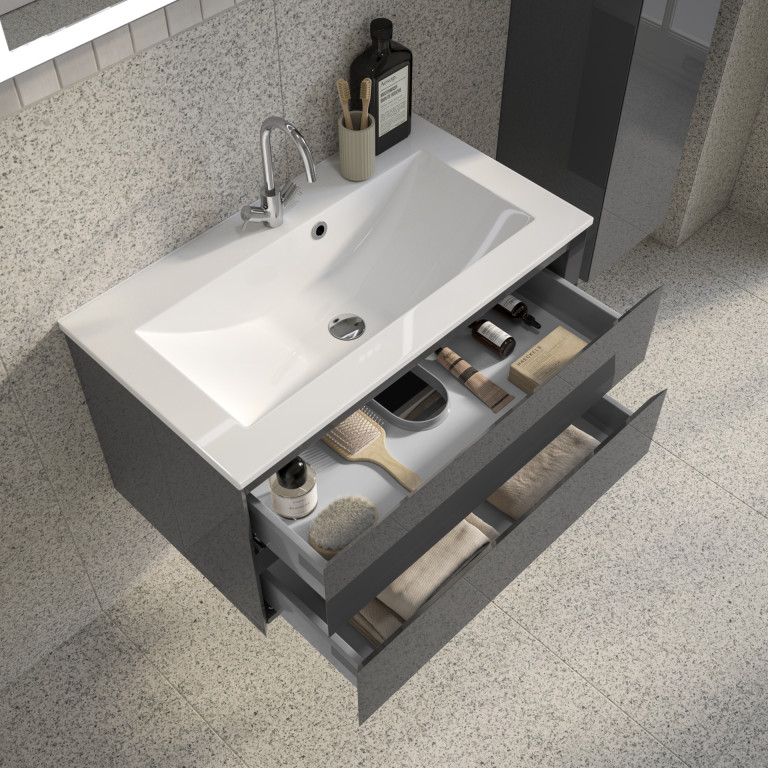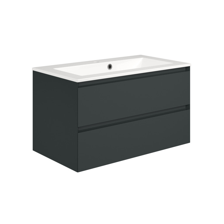 Vernas effortlessly combines modern elegance and functionality with its sleek profile, angled integrated handles, and spacious, soft-close drawers, keeping your bathroom clutter-free. The easy-to-clean cast vanity basin and water-resistant finish further enhance its practicality and durability. - Vernas 800mm two-drawer wall-hung vanity unit.