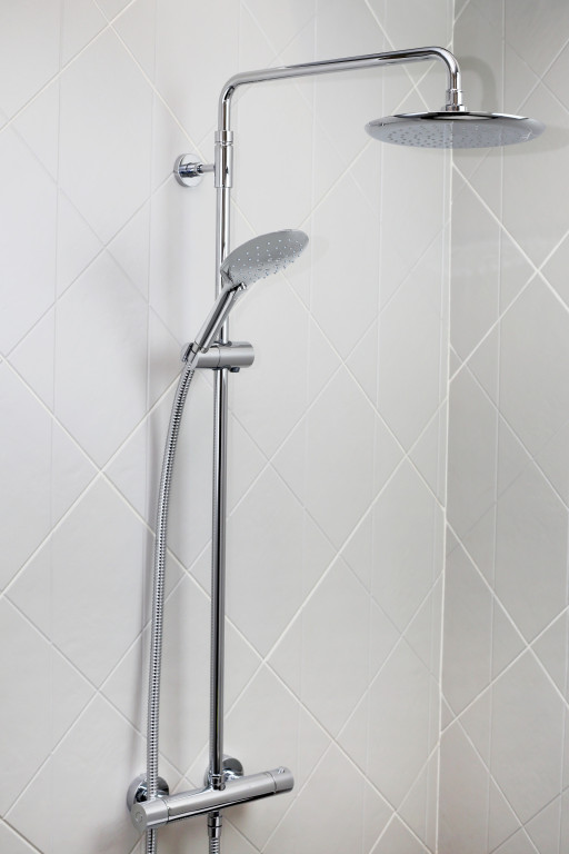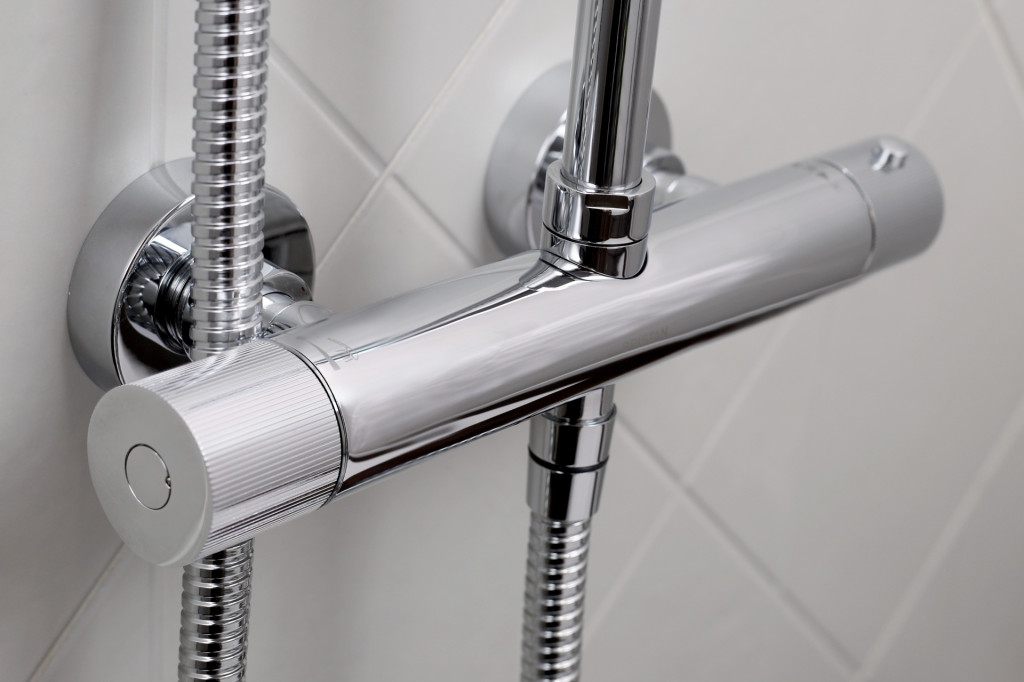 Versatile Carre has been designed to blend well with almost any bathroom, with an adjustable height rigid riser, sleek chrome shower heads, and unique tactile handles