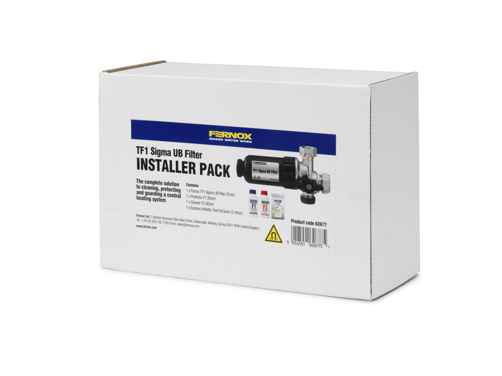 The Fernox TF1 Sigma UB Installer Pack is the complete solution to cleaning, protecting and guarding a central heating system in line with BS 7593:2019 and the Benchmark Commissioning Checklist. It includes the industry leading TF1 Sigma UB Filter, Fernox Cleaner F3 and Fernox Protector F1 265ml and Fernox Express Inhibitor Test Foil Pack (x2 test strips).