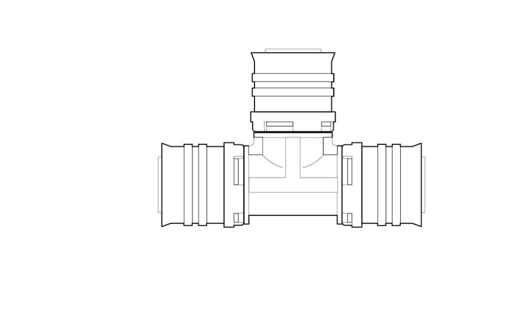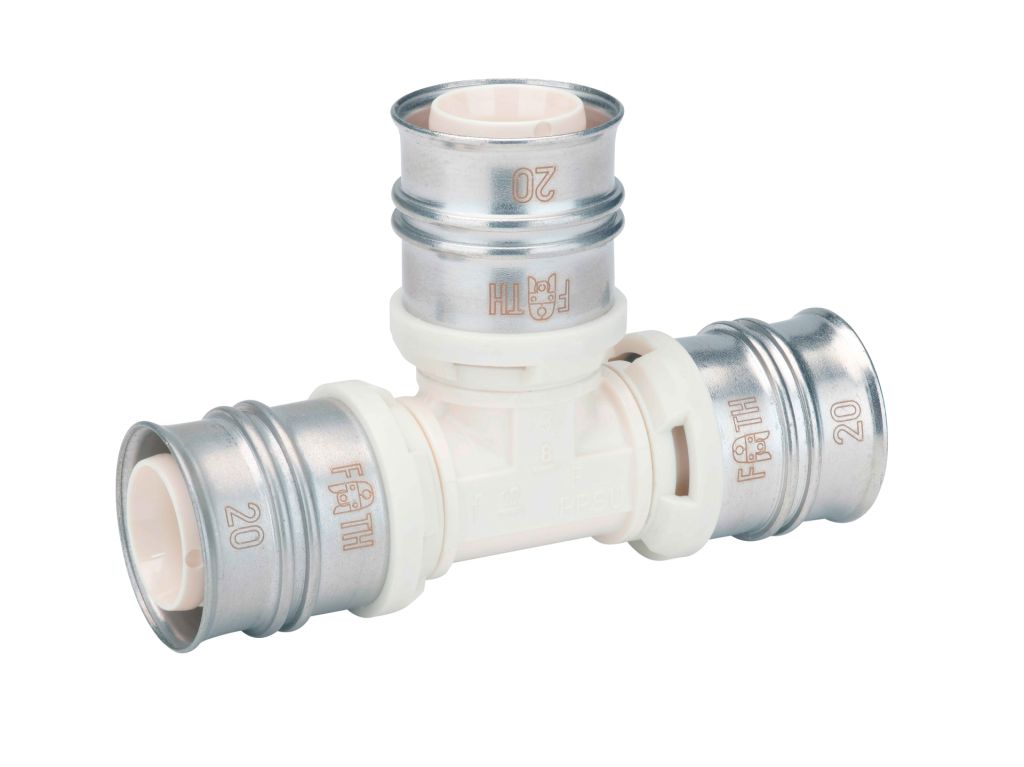 Tee made of PPSU for drinking water and heating system installations featuring white fixation rings with integrated inspection holes, fixed stainless steel pressing sleeves and leak function. Pressable with pressing contours F and TH.