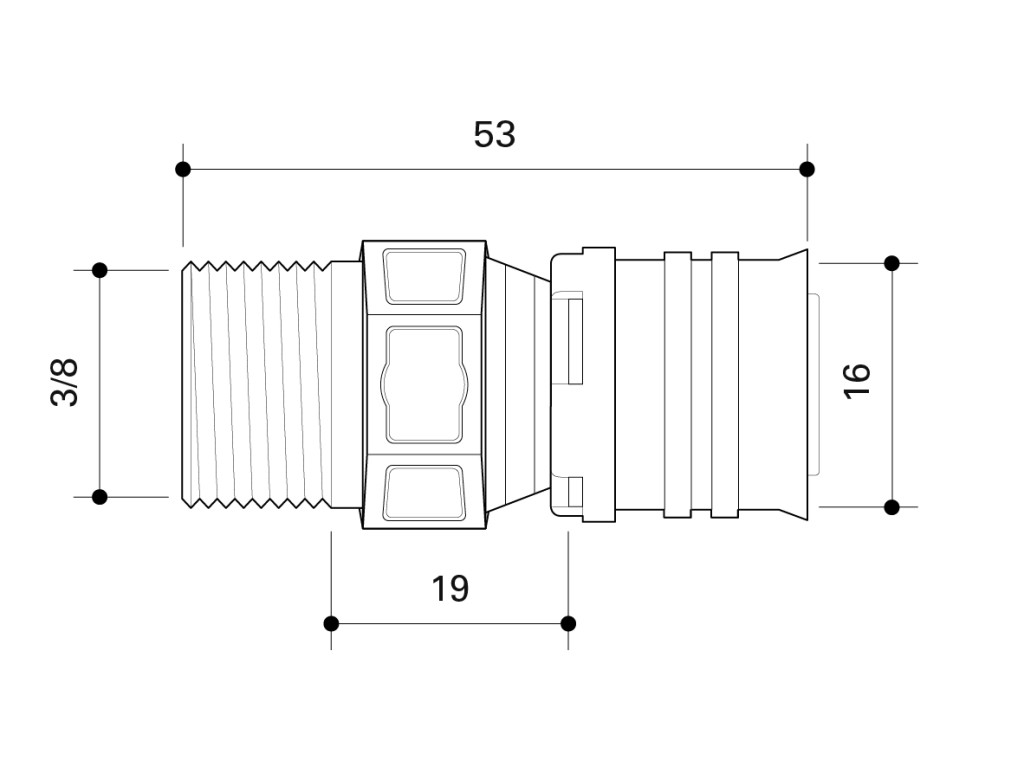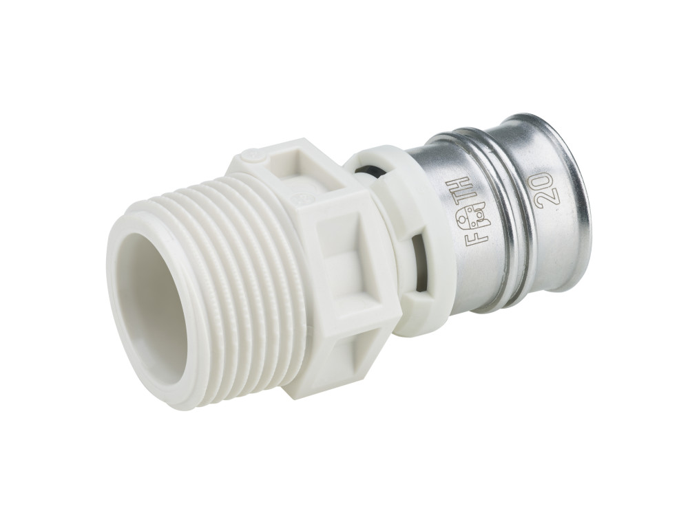Male thread adapter according to DIN EN 10226-1 made of PPSU for drinking water and heating system installations featuring a white fixation ring with integrated inspection holes, fixed stainless steel pressing sleeve and leak function. Pressable with pressing contours F and TH.
