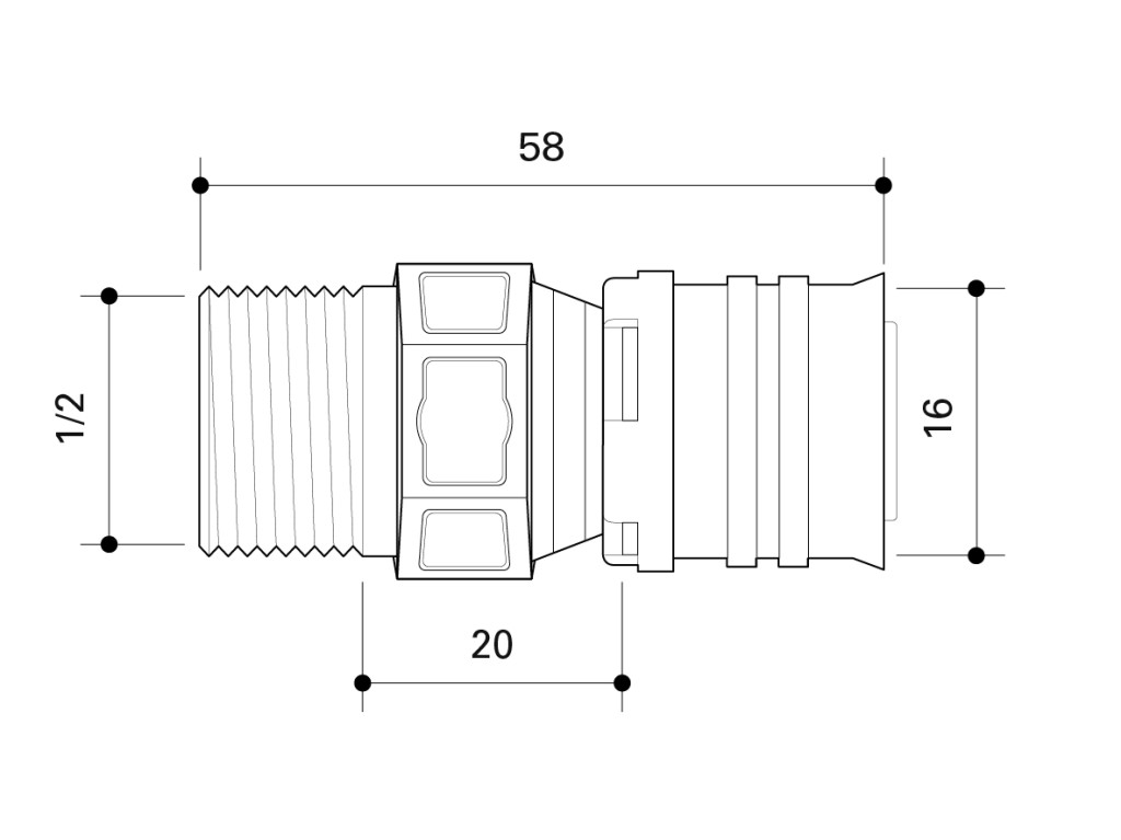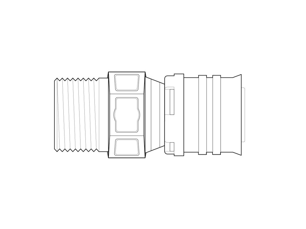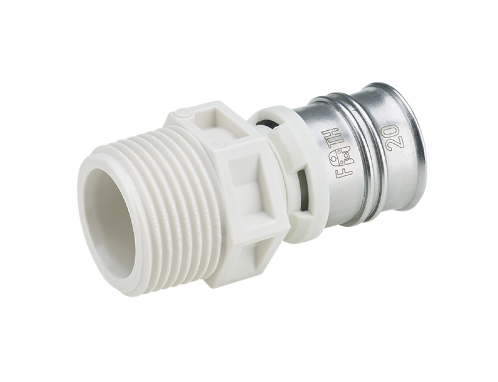 Male thread adapter according to DIN EN 10226-1 made of PPSU for drinking water and heating system installations featuring a white fixation ring with integrated inspection holes, fixed stainless steel pressing sleeve and leak function. Pressable with pressing contours F and TH.
