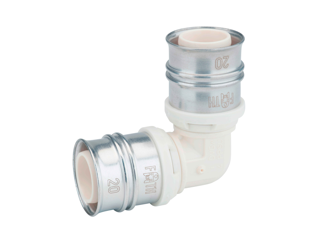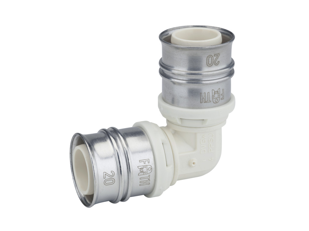 90 degrees elbow made of PPSU for drinking water and heating system installations featuring white fixation rings with integrated inspection holes, fixed stainless steel pressing sleeves and leak function. Pressable with pressing contours F and TH.