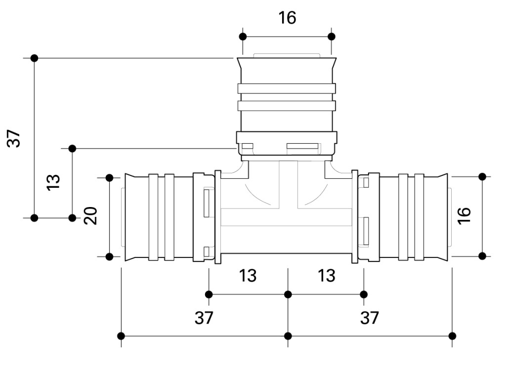Reduced tee made of PPSU for drinking water and heating system installations featuring white fixation rings with integrated inspection holes, fixed stainless steel pressing sleeves and leak function. Pressable with pressing contours F and TH.
