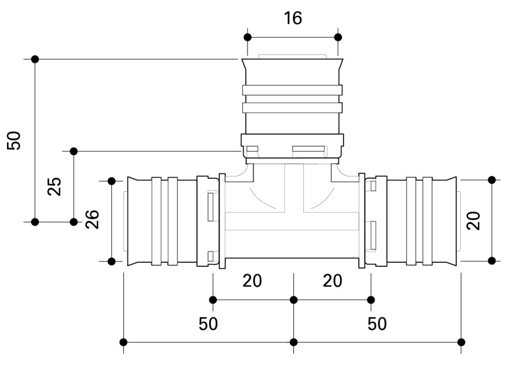 Reduced tee made of PPSU for drinking water and heating system installations featuring white fixation rings with integrated inspection holes, fixed stainless steel pressing sleeves and leak function. Pressable with pressing contours F and TH.