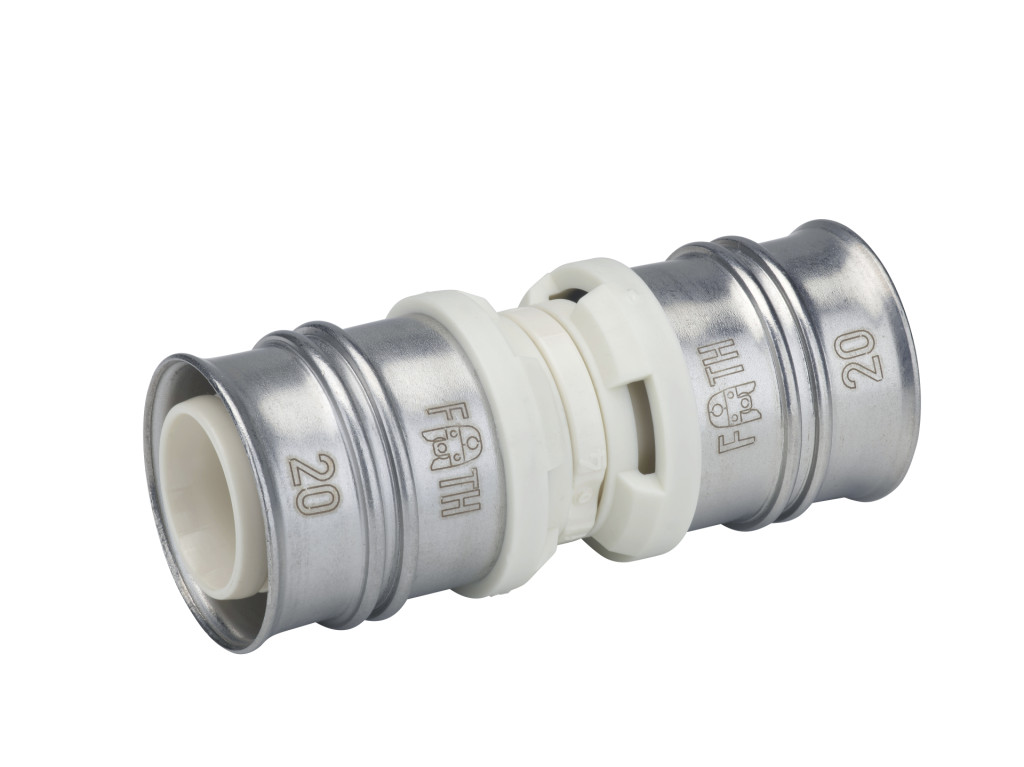 Coupling made of PPSU for drinking water and heating system installations featuring white fixation rings with integrated inspection holes, fixed stainless steel pressing sleeves and leak function. Pressable with pressing contours F and TH.