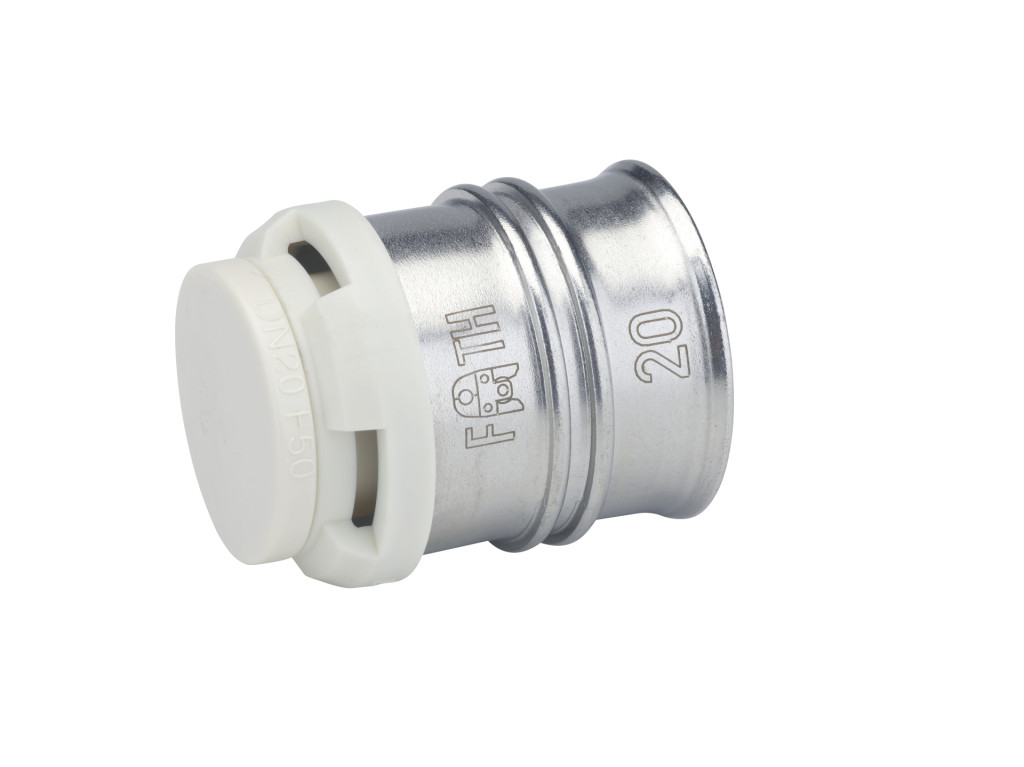 End cap made of PPSU to seal pipe ends in drinking water and heating systems featuring a white fixation ring with integrated inspection holes, fixed stainless steel pressing sleeve and leak function. Pressable with pressing contours F and TH.