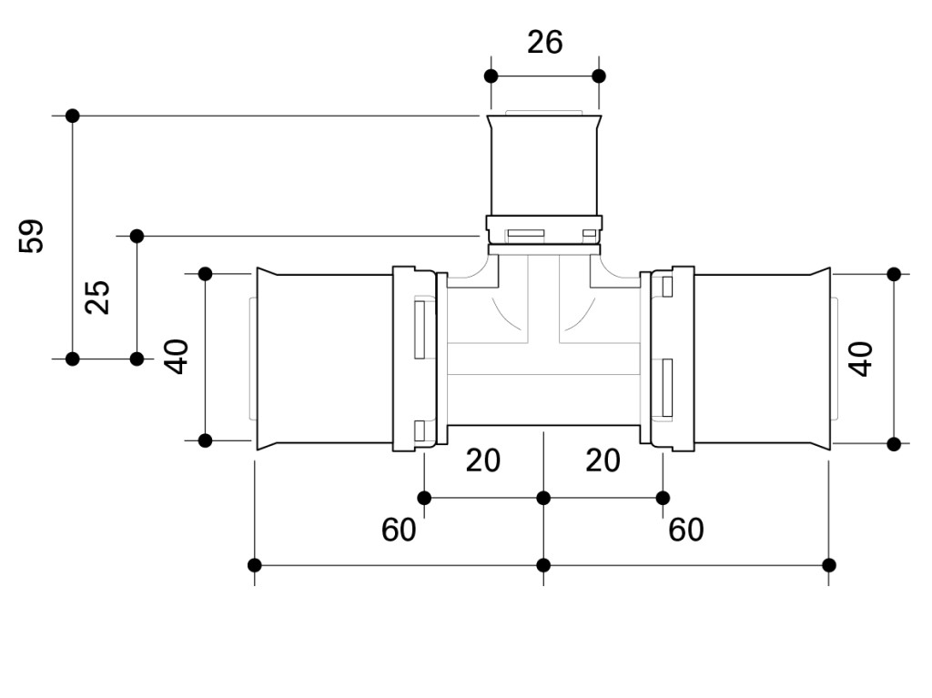 Reduced tee made of PPSU or dezincification-resistant brass for drinking water and heating system installations featuring white fixation rings with integrated inspection holes, fixed stainless steel pressing sleeves and leak function. Can be pressed using the F-contour, the dimensions smaller than or equal to 32 mm also with the TH pressing contour.