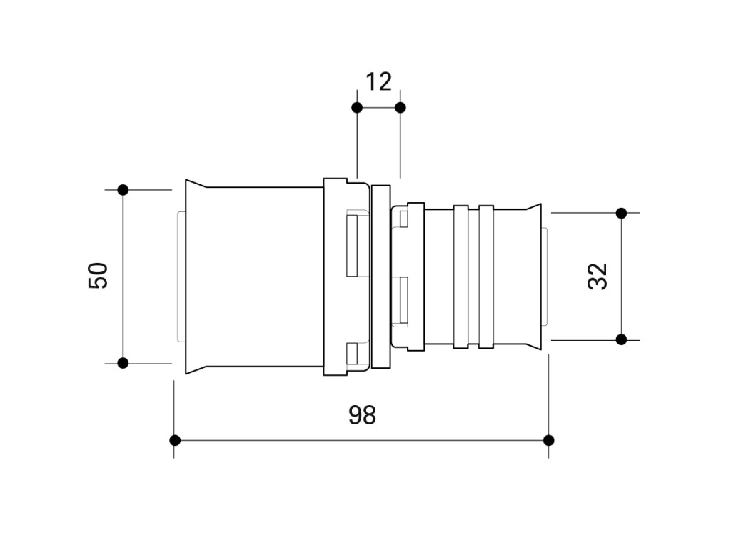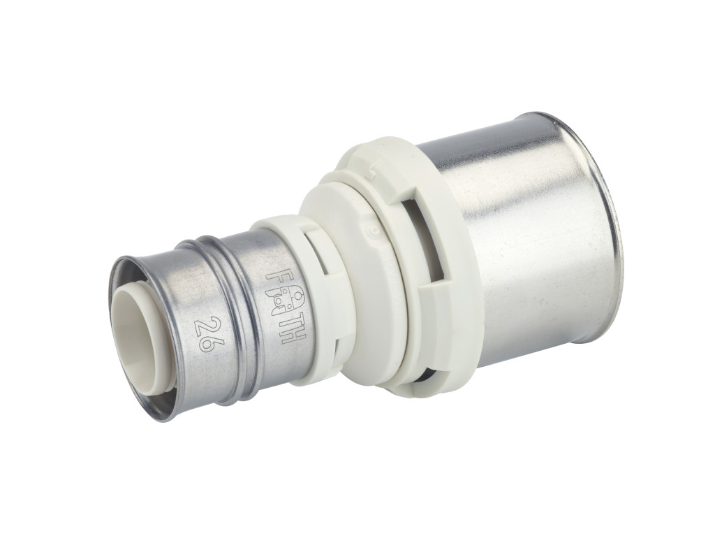 Reduced coupling made of PPSU or dezincification-resistant brass for drinking water and heating system installations featuring white fixation rings with integrated inspection holes, fixed stainless steel pressing sleeves and leak function. Can be pressed using the F-contour, the dimensions smaller than or equal to 32 mm also with the TH pressing contour.