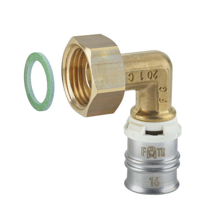Flat-sealing elbow adapter made of dezincification-resistant brass to create detachable connections in drinking water and heating systems featuring a white fixation ring with integrated inspection holes, fixed stainless steel pressing sleeve and leak function. Pressable with pressing contours F and TH.