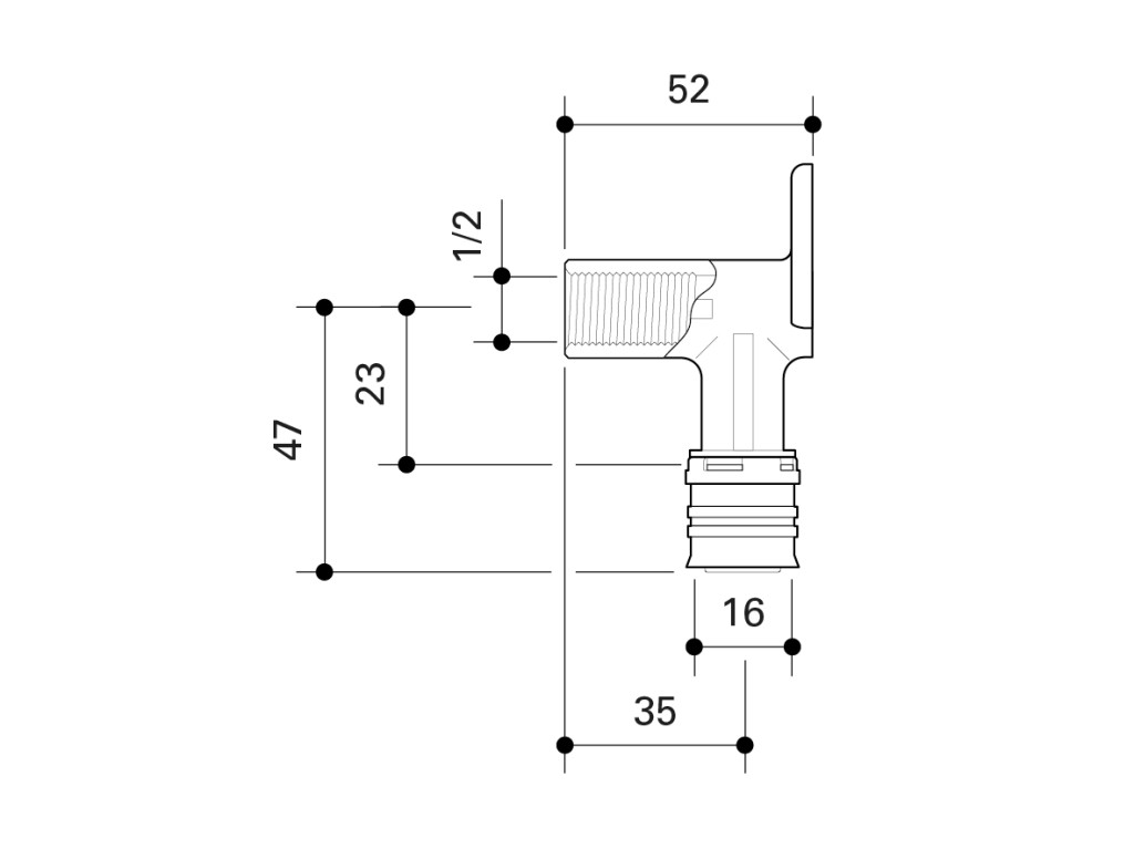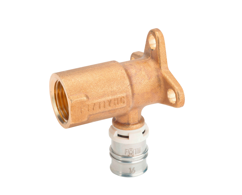 Female thread 52 mm wall mount elbow according to DIN EN 10226-1 made of dezincification-resistant brass for fitting connection in tee and serial installations in drinking water systems featuring a white fixation ring with integrated inspection holes, fixed stainless steel pressing sleeve and leak function. Pressable with pressing contours F and TH.