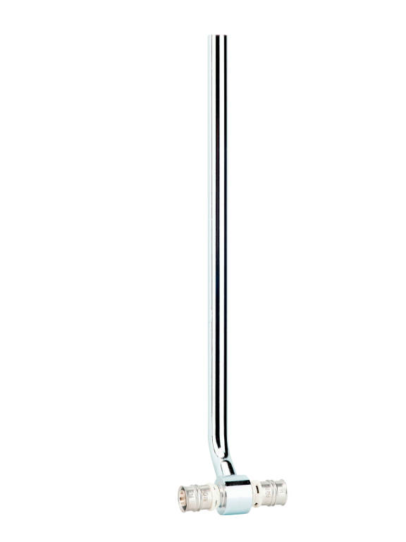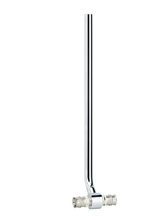 Radiator connection tee made of brass with nickel-plated copper pipe 15x1 for wall or floor connection of radiators featuring a white fixation ring with integrated inspection holes, fixed stainless steel pressing sleeve and leak function. Pressable with pressing contours F and TH.