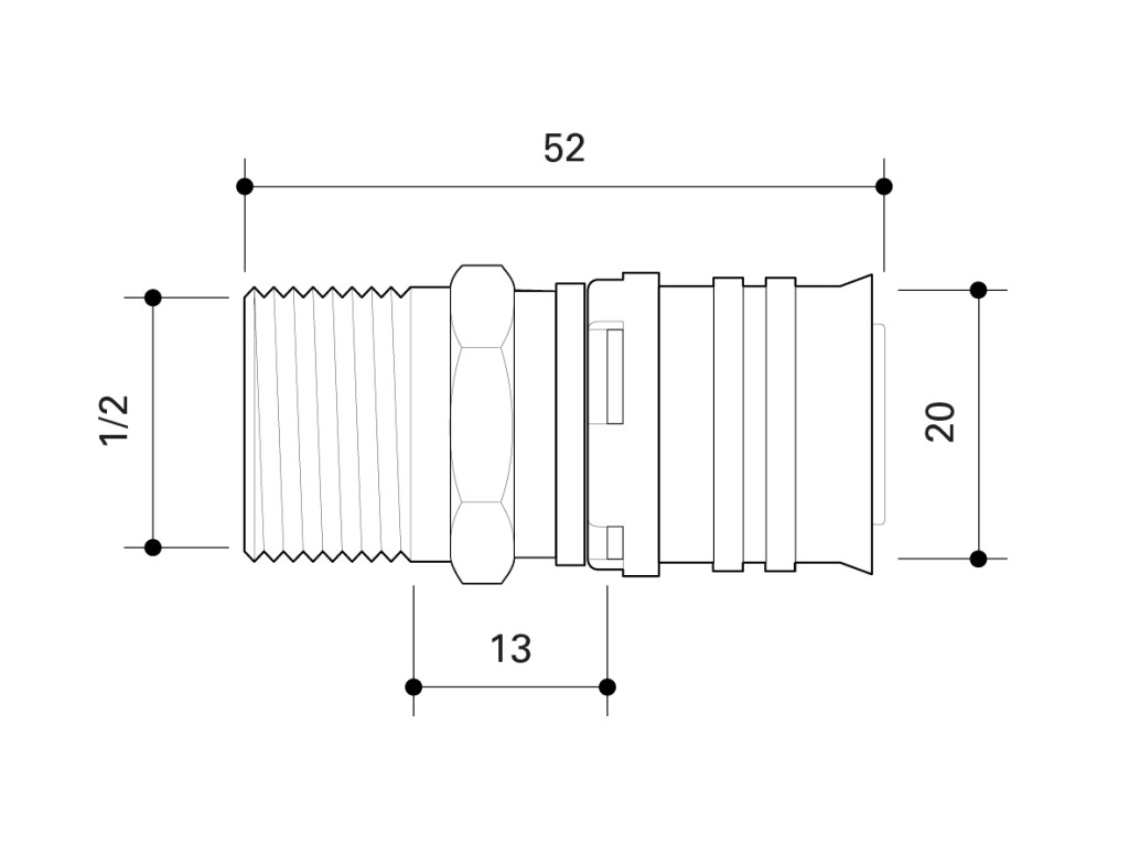 Male thread adapter according to DIN EN 10226-1 made of dezincification-resistant brass for drinking water and heating system installations featuring a white fixation ring with integrated inspection holes, fixed stainless steel pressing sleeve and leak function. Pressable with pressing contours F and TH.