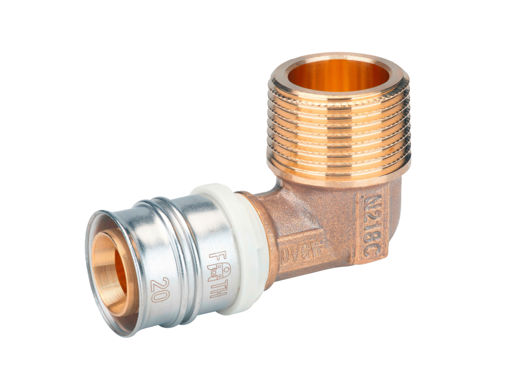 Male thread elbow adapter according to DIN EN 10226-1 made of dezincification-resistant brass for drinking water and heating system installations featuring a white fixation ring with integrated inspection holes, fixed stainless steel pressing sleeve and leak function. Pressable with pressing contours F and TH.