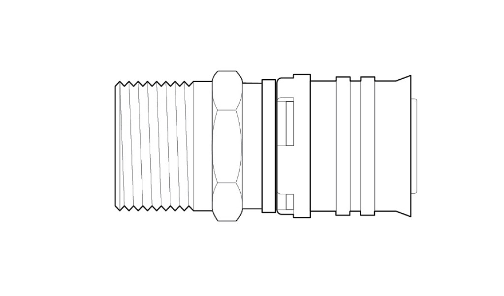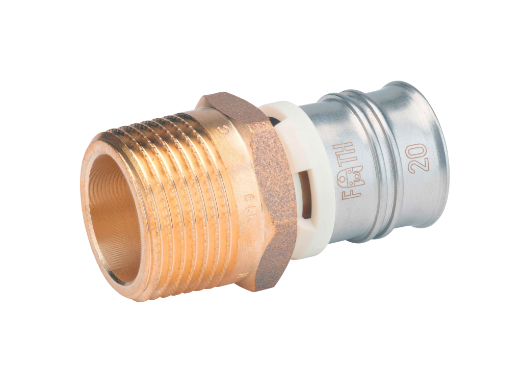 Male thread adapter according to DIN EN 10226-1 made of dezincification-resistant brass for drinking water and heating system installations featuring a white fixation ring with integrated inspection holes, fixed stainless steel pressing sleeve and leak function. Pressable with pressing contours F and TH.