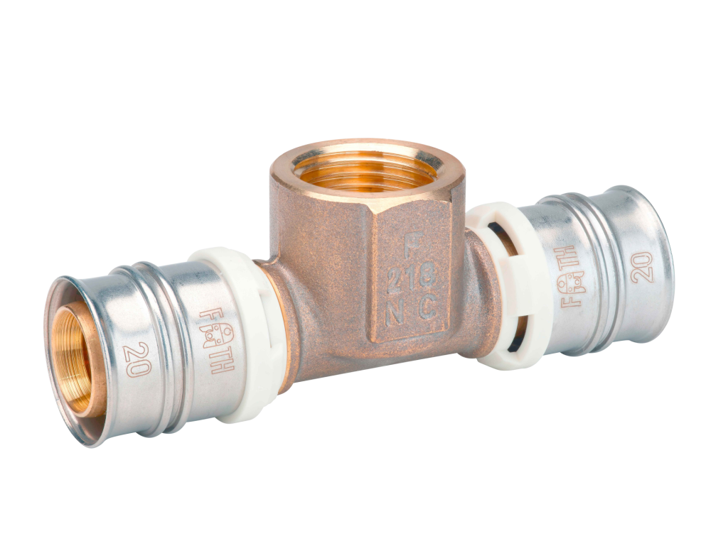 Female thread tee adapter according to DIN EN 10226-1 made of dezincification-resistant brass for drinking water and heating system installations featuring white fixation rings with integrated inspection holes, fixed stainless steel pressing sleeves and leak function. Pressable with pressing contours F and TH.