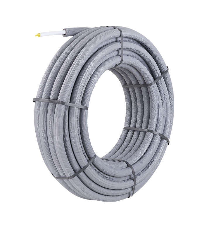 Multilayer composite pipe, colour: white, in coils made of cross-linked polyethylene (PE-Xb) as inner surface, longitudinally butt-welded aluminium pipe, and polyethylene of raised temperature resistance (PE-RT) as outer surface for drinking water and heating system installations, wrapped in pipe insulation made of flexible closed-cell PE foam with thermal conductivity group 040.