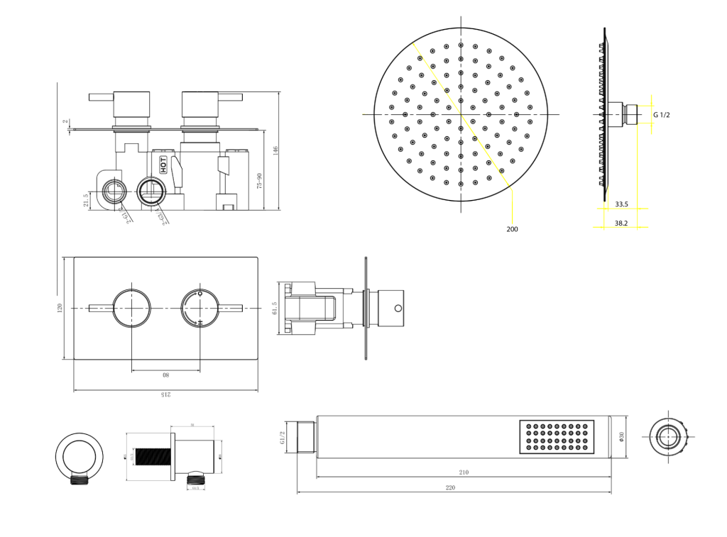 Twin Valve, Round Shower Head, Round Riser Kit, Outlet Elbow, Hose, Handset