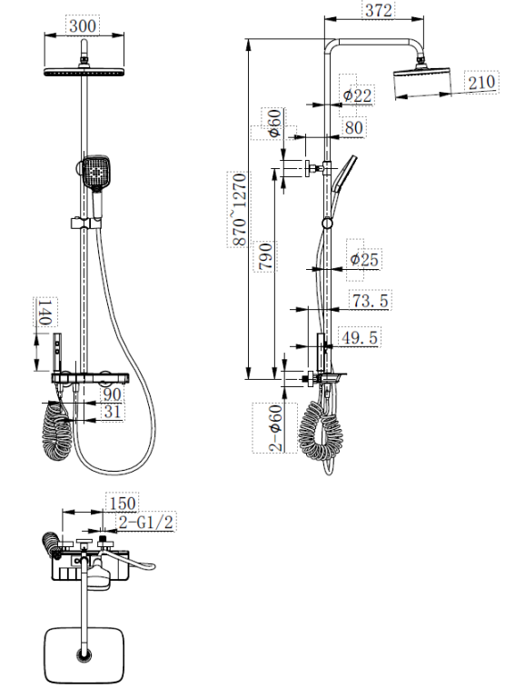 - 372mm (L) x 300mm (W) x 1270mm (H)