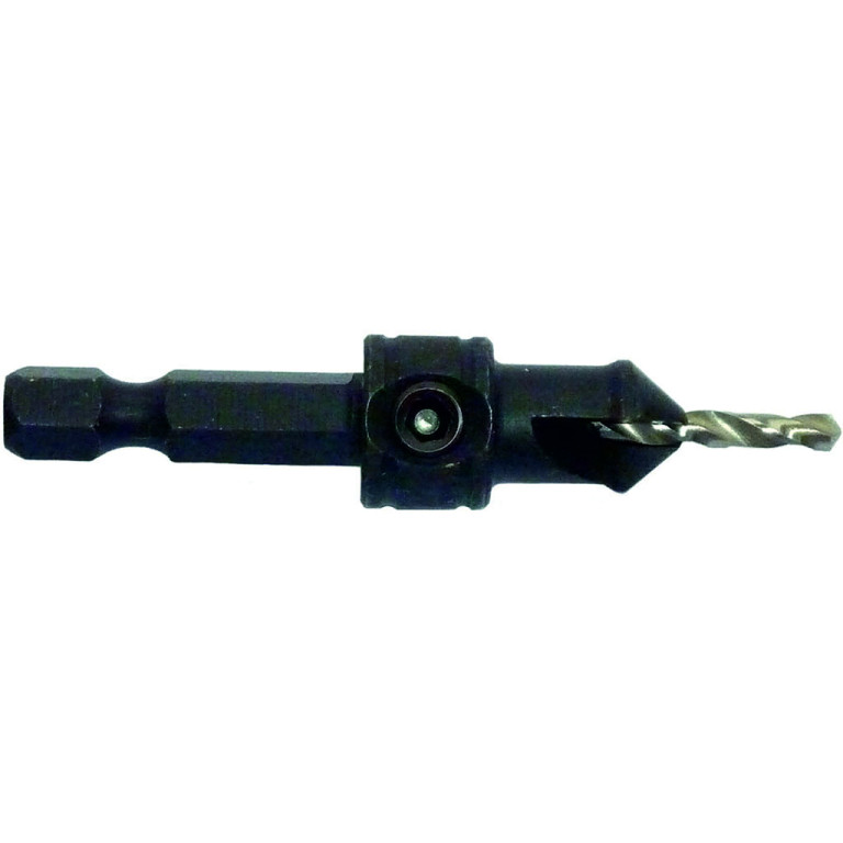 Countersink with a replaceable HSS drill that creates a sharp clean finish without burring. Adjustable HSS drill bit produces a pilot hole ahead of countersinking and can be adjusted to suit different length screws. 1/4" Hex quick change shank. Suitable for wood and PVC.