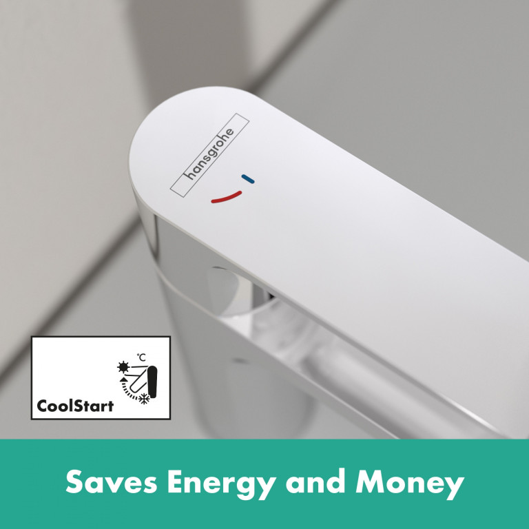 - Saving energy: If the lever is in the centre, only cold water comes in. Hot water only flows when it is turned to the left (CoolStart)